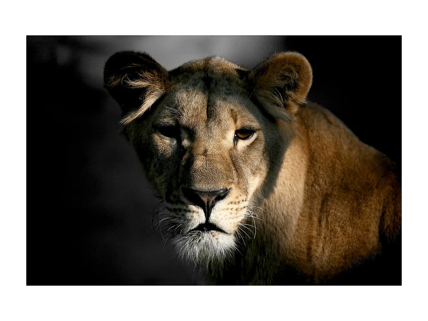 Tableau sur verre lionne dans l'ombre 45x65 cm